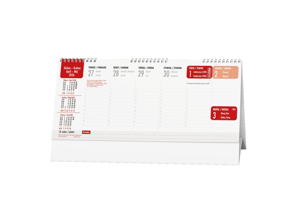Stolní manažerský daňový kalendář na rok 2026. Týdenní kalendárium s hodinovými řádky (Po-Pá) a místem pro poznámky. Obsahuje daňové kalendárium, přehled přiznání a plateb daní, české a slovenské jmenné kalendárium, mezinárodní svátky a citáty slavných. Zahrnuje přehled 3 měsíců.