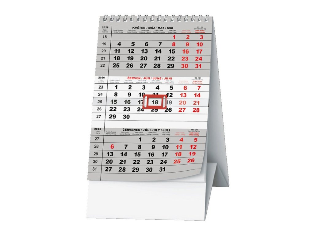 Praktický stolní kalendář na rok 2026. Každá stránka ukazuje 3 měsíce najednou (např. květen, červen, červenec). Mezinárodní kalendárium (názvy měsíců/dnů) s čísly týdnů. Zvýrazněné neděle a svátky (červeně). Obsahuje ukazatel aktuálního data. Ideální pro pracovní stůl.