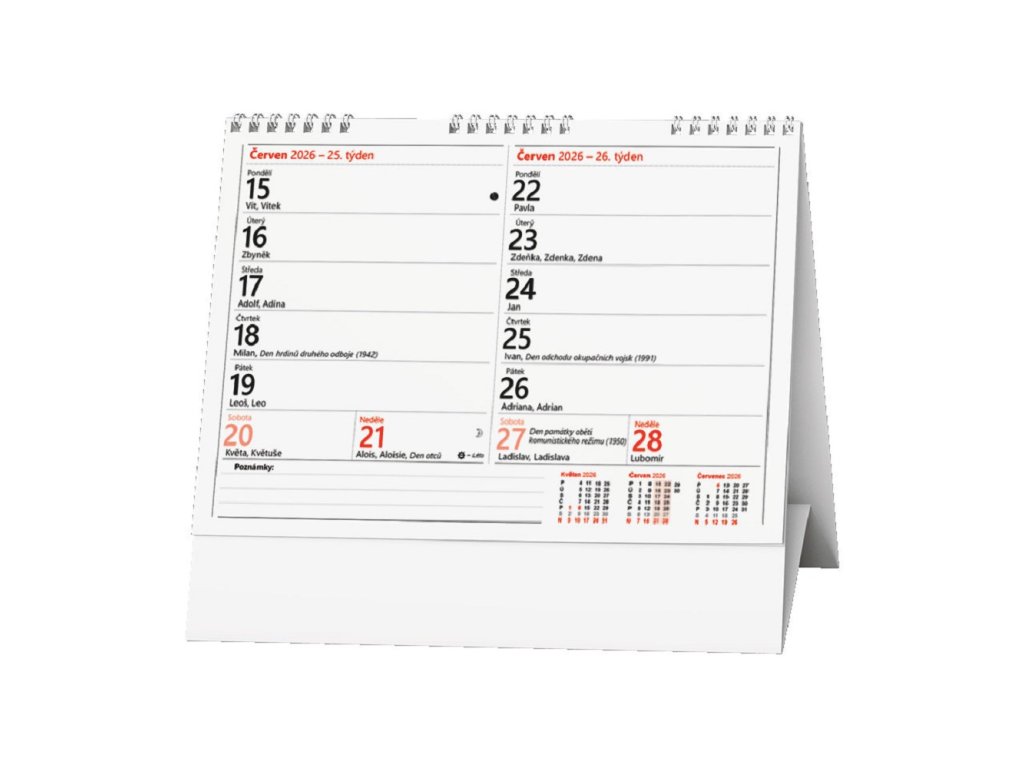 Praktický stolní pracovní kalendář 2026. Rozložení nabízí přehled 14 dnů na jedné stránce. Obsahuje české jmenné kalendárium, státní svátky, významné dny a prostor pro poznámky. Přehledně zobrazuje také následující 3 měsíce. Ideální pro plánování.