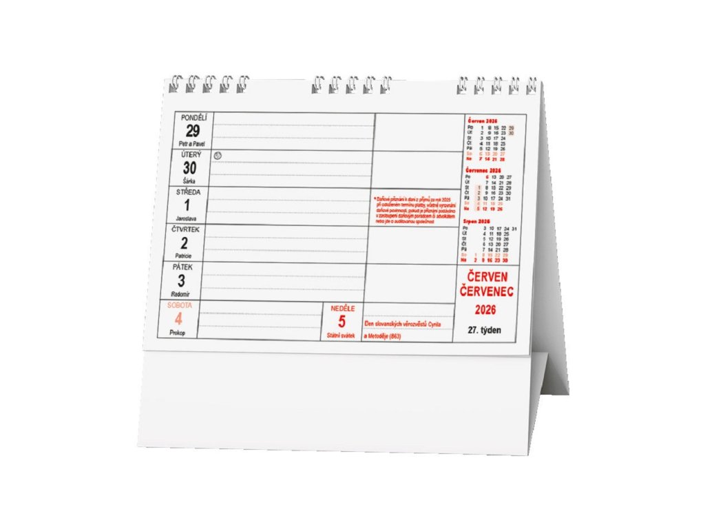 Kompaktní stolní daňový kalendář 2026. Týdenní kalendárium (1 týden na stránku) s jmény, svátky a místem pro poznámky. Zahrnuje důležité termíny pro daňové povinnosti (např. přiznání k DPH). Ideální pro podnikatele, účetní a daňové poradce.