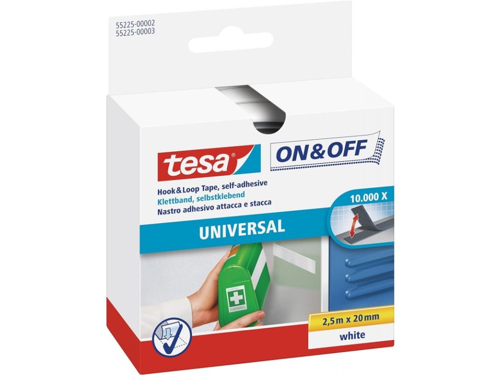 - Samolepicí pás pro univerzání použití "On&Off 55225", bílá, suchý zip, 20 mm x 2,5 m, TESA
