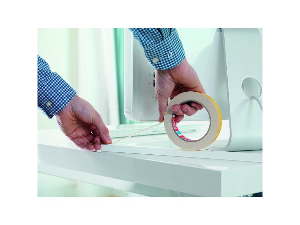 - Oboustranná samolepicí montážní páska úzkého střihu pro bezpečné a trvalé interiérové upevnění podlahových desek, dekorací, kabelových lišt a jiných.