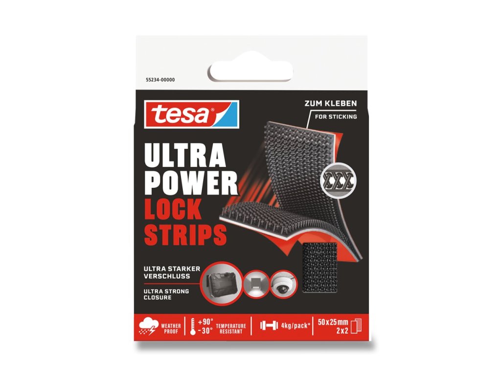 Tesa® Ultra Power Lock je mimořádně pevná samolepicí páska se suchým zipem, navržená pro bezpečné uchycení těžkých předmětů v interiéru i exteriéru. Díky inovativnímu zamykacímu mechanismu s háčky ve tvaru houby a silné lepicí vrstvě unese až 4 kg na balení. Spoj lze opakovaně otevírat a zavírat v libovolném směru, přičemž zůstává pevný a spolehlivý. Páska je odolná vůči UV záření, povětrnostním vlivům a extrémním teplotám od -30 °C do +90 °C. Není vhodná pro použití na textil, PE a PP plasty, tapety ani citlivé povrchy.