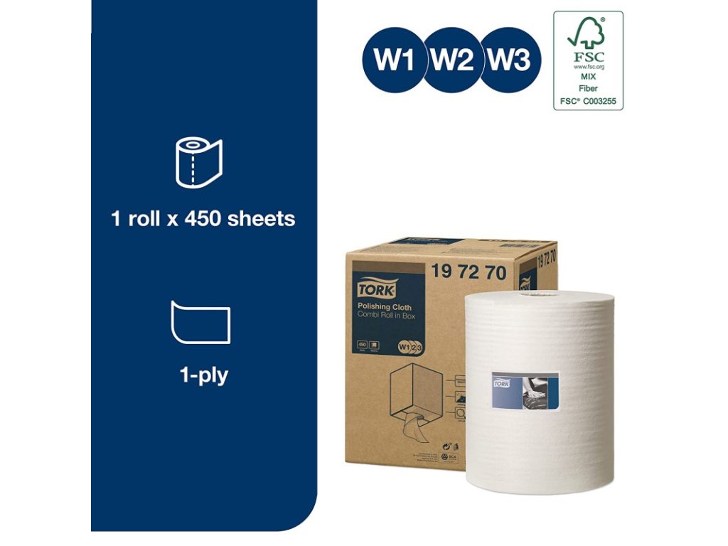 Tork 197270, bílá leštící utěrka na roli, 450 útržků, W1 W2 W3, návin 171 m