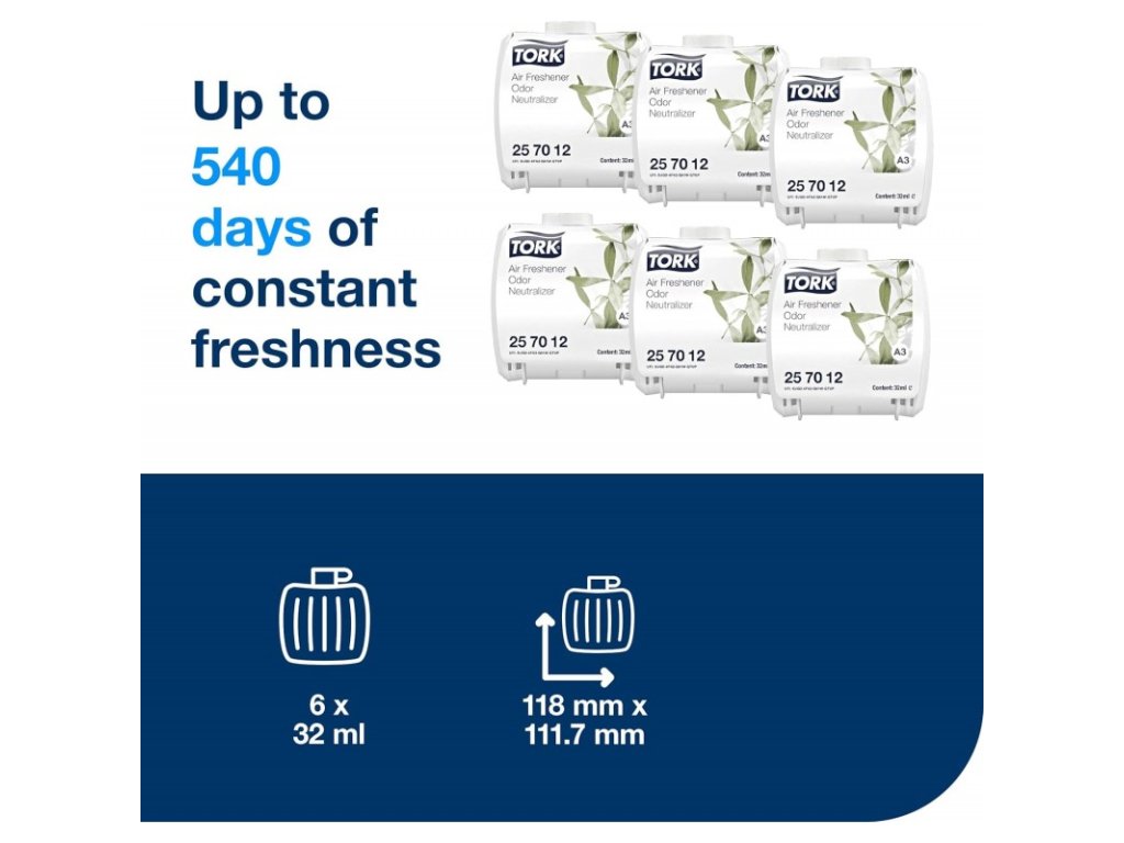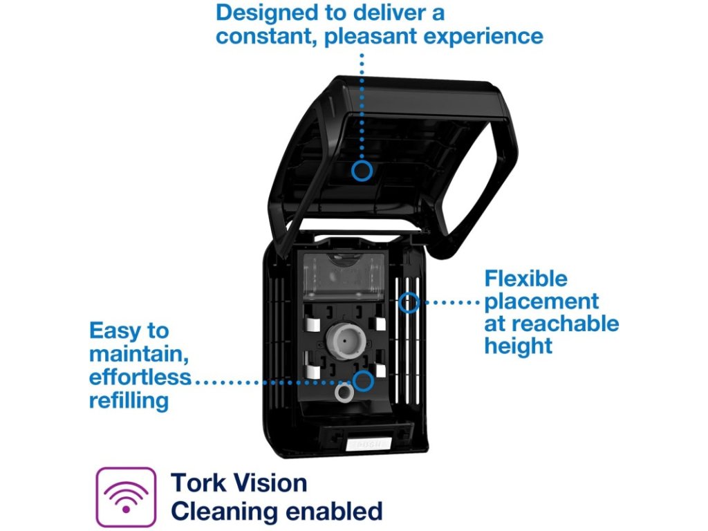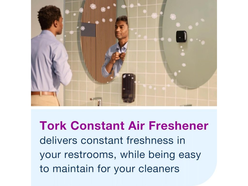 - Tork zásobník na osvěžovač vzduchu Constant v designu Elevation využívá jedinečnou technologii, díky které se vůně šíří trvale a rovnoměrně. Certifikované snadné použití pro doplňování bez námahy. K dispozici jsou tři pečlivě vybrané vůně – jarní vánek, květinová vůně a vůně neutralizující zápach, které zajišťují na každé toaletě dlouhotrvající svěžest.