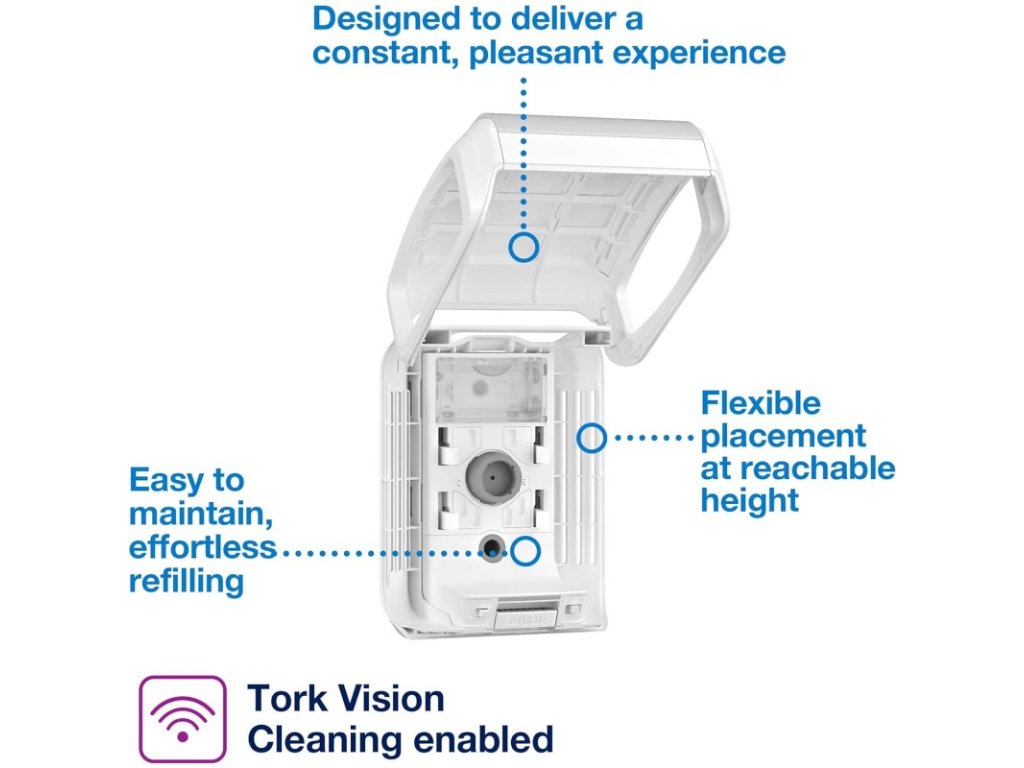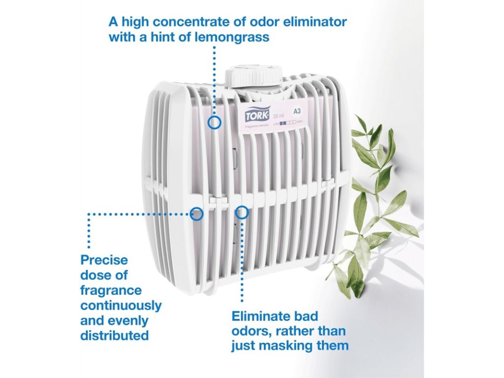 - Tork zásobník na osvěžovač vzduchu Constant v designu Elevation využívá jedinečnou technologii, díky které se vůně šíří trvale a rovnoměrně. Certifikované snadné použití pro doplňování bez námahy. K dispozici jsou tři pečlivě vybrané vůně – jarní vánek, květinová vůně a vůně neutralizující zápach, které zajišťují na každé toaletě dlouhotrvající svěžest.