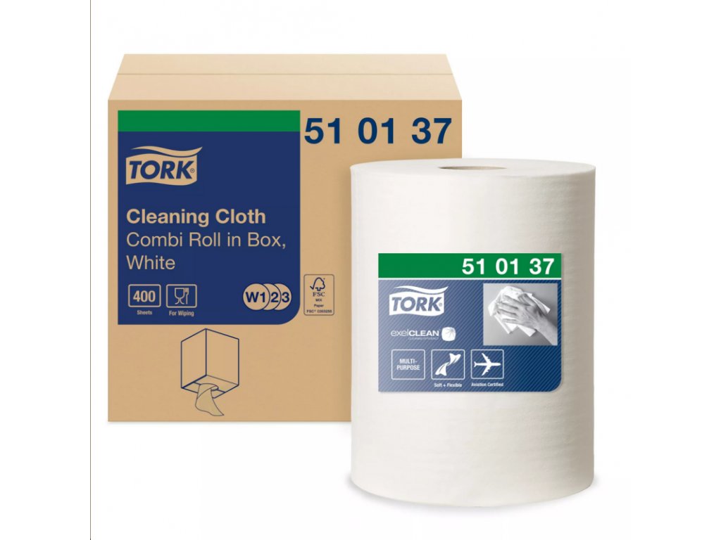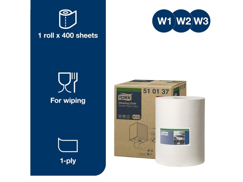 Tork 510137, jemná čisticí utěrka 1 vrstvá bílá, 400 útržků, W1 W2 W3, návin 152 m