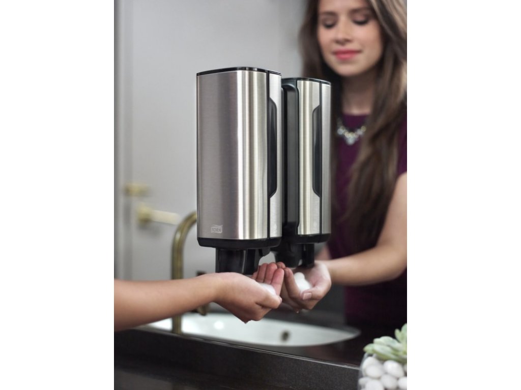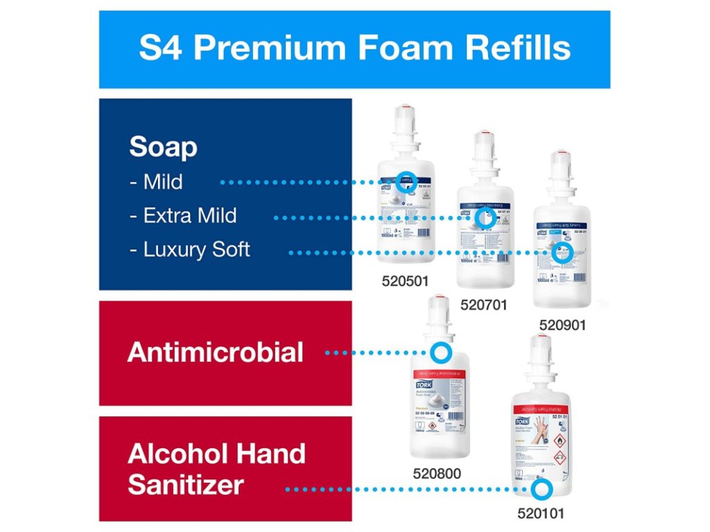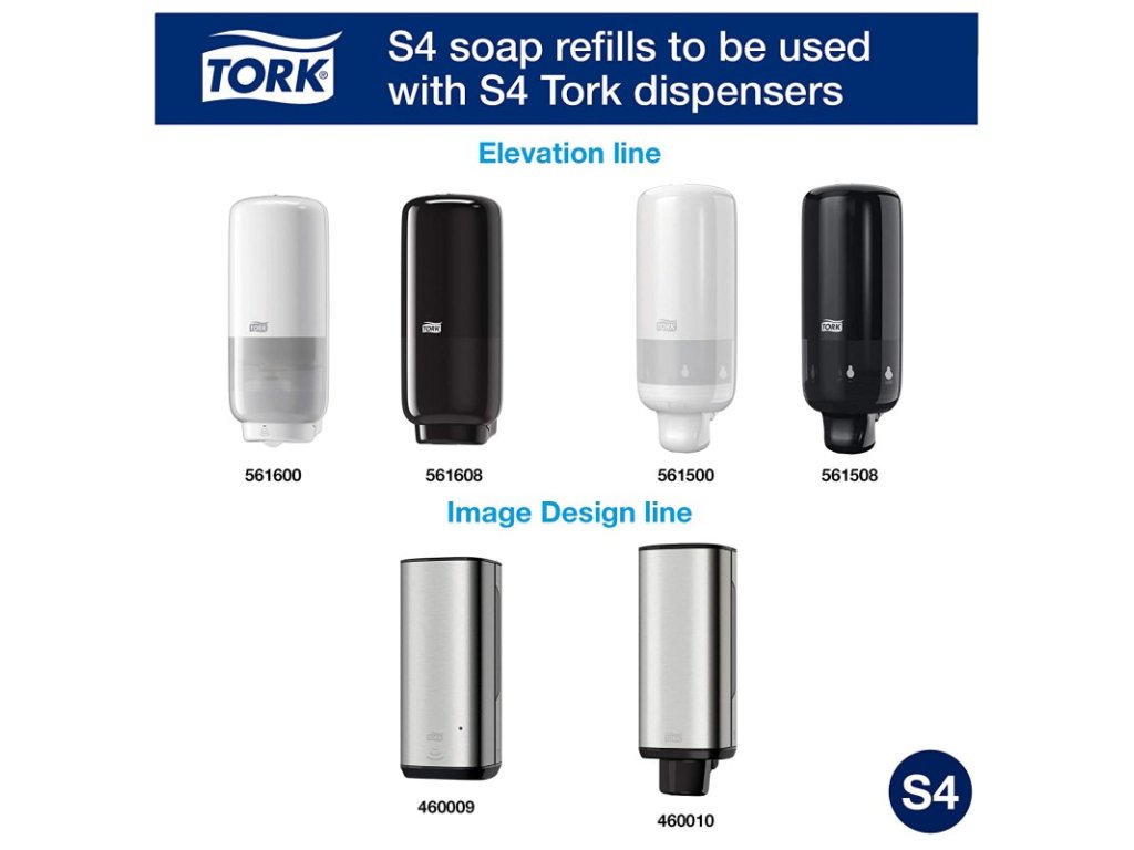 Tento dezinfekční prostředek je vhodný do všech zásobníků Tork na mýdla a dezinfekční prostředky S4, které jsou certifikovány pro snadné použití a podporují správné dodržování hygieny rukou.