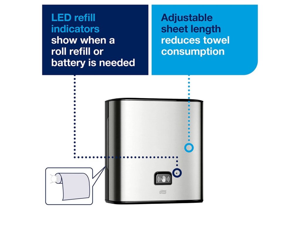 - Bezdotykové dávkování po jednom útržku snižuje spotřebu a zlepšuje hygienu