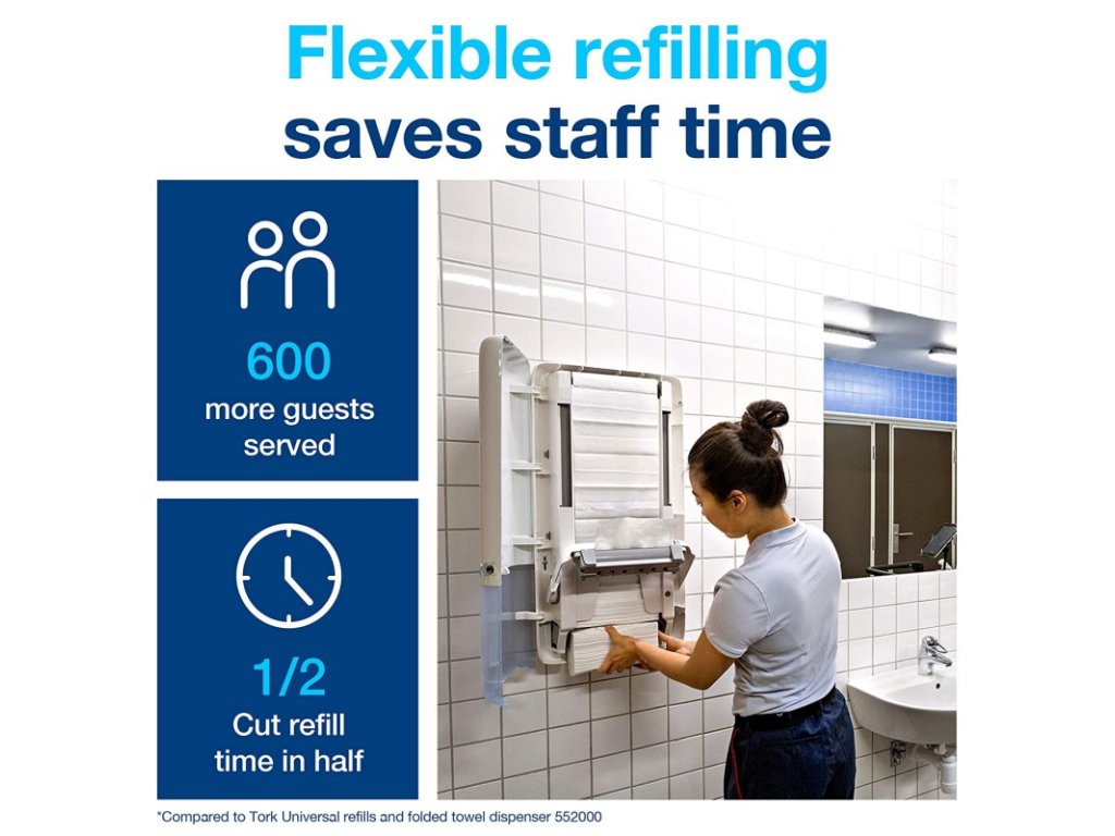 - Kompatibilní s Tork PeakServe® nazazujícími papírovými ručníky, systém má velmi vysoký kapacitu a to více než 2100 ručníků, které lze rychle a bez přerušení doplňovat, aby se udržela návaznost.