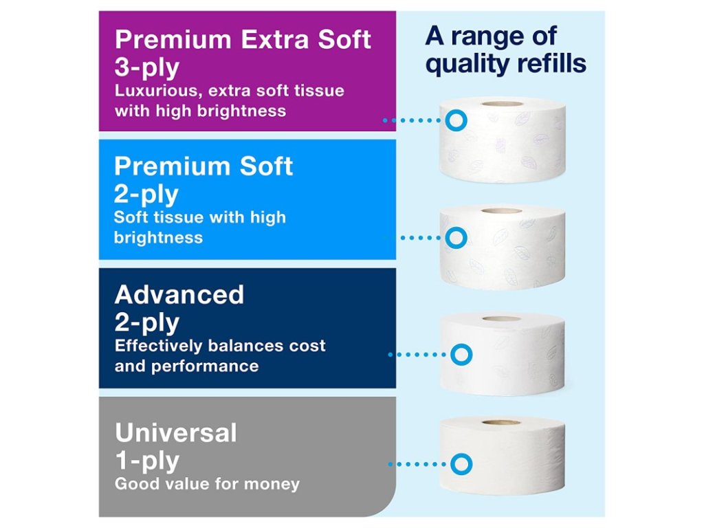 Systém Tork mini Jumbo se vyznačuje časovou efektivitou a nižšími náklady a nabízí mnohem větší objem toaletního papíru než standardní role. Role dvouvrstvého toaletního papíru Tork mini Jumbo v kvalitě Premium se vyznačuje prvotřídním vzhledem, je měkký na omak a zároveň maximálně funkční. Je vhodný pro provozovny se střední až vysokou návštěvností.
