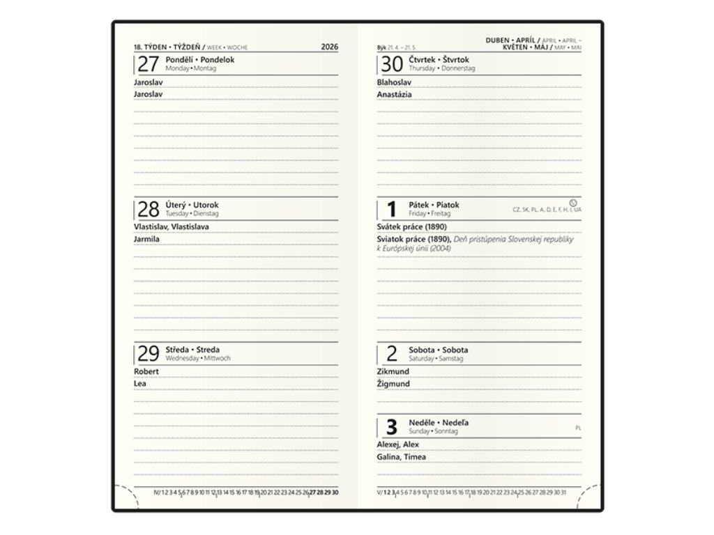 - Informační stránky: osobní údaje, přehledný kalendář 2026 a 2027, měsíční plánování 2026, plán dovolených 2026, česká a slovenská křestní jména, mezinárodní svátky, roční plánovací kalendář CZ 2026 místo pro poznámky