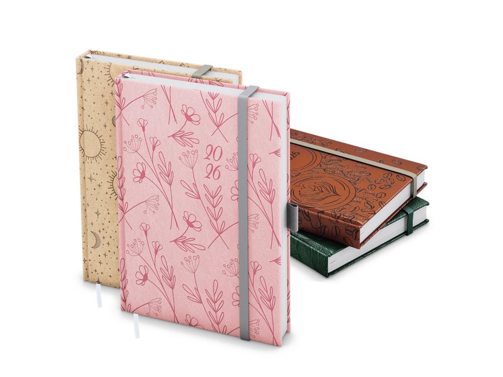 - Vazba/obálka/karton: jemný hladký materiál, ražba roku, jednostranná pěnová výplň desek, rovný hřbet, šitá vazba V8, stužka, gumička, poutko na propisku, perforovanérožky, vlepená kapsa