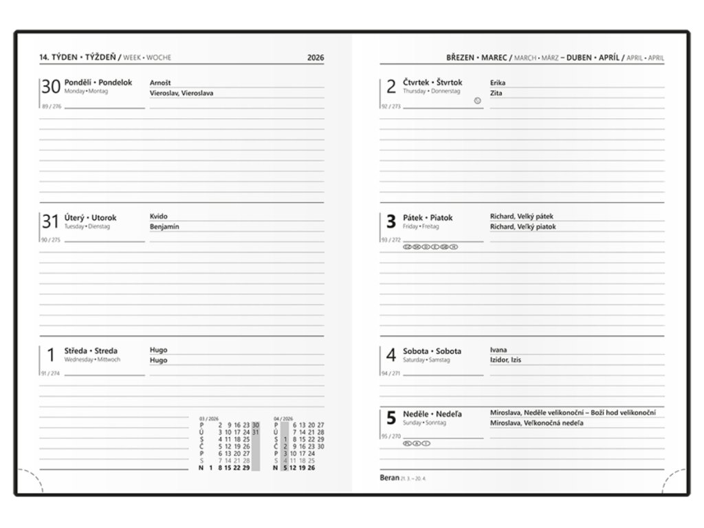 - Vazba/obálka/karton: jemný hladký materiál, ražba roku, jednostranná pěnová výplň desek, rovný hřbet, šitá vazba V8, stužka, gumička, poutko na propisku, perforovanérožky, vlepená kapsa