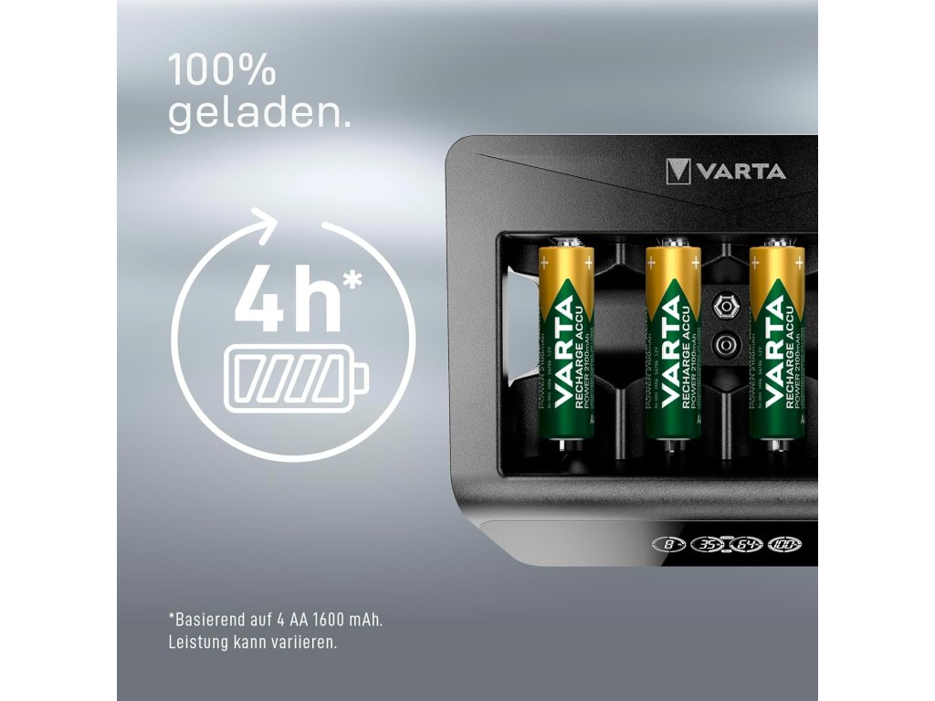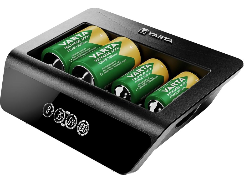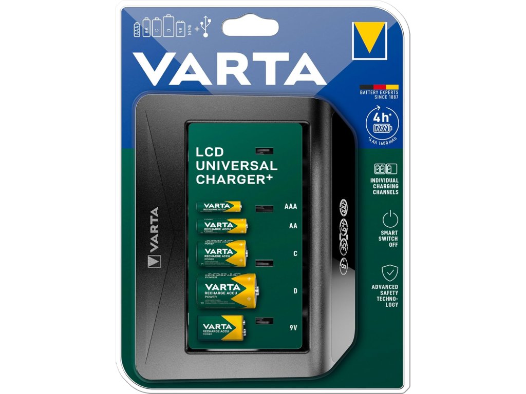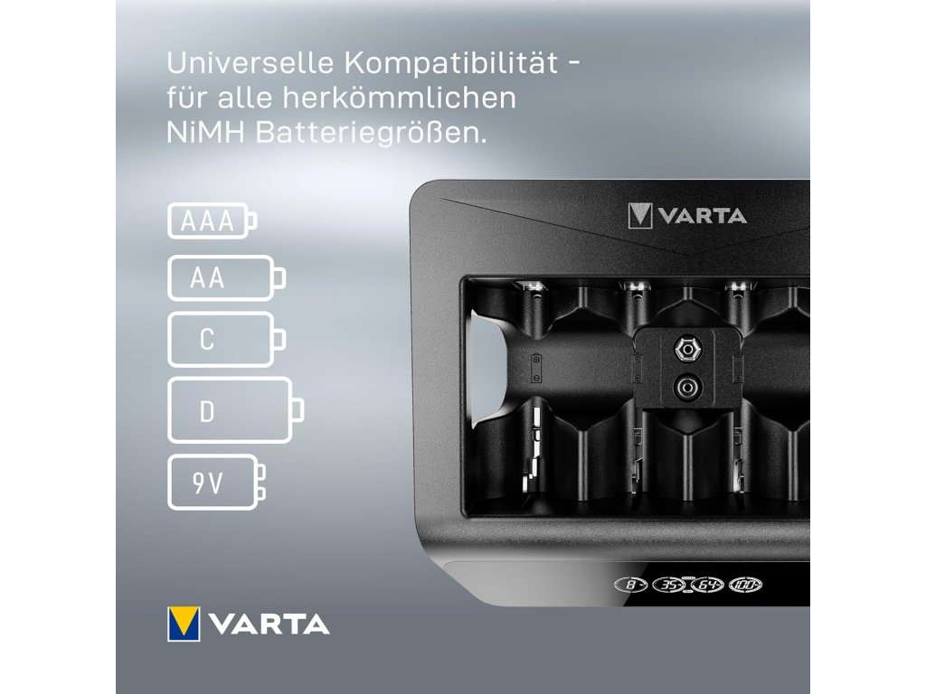 VARTA Universal LCD nabíječka baterií AA AAA C D 9V NiMH USB výstup 100–240 V