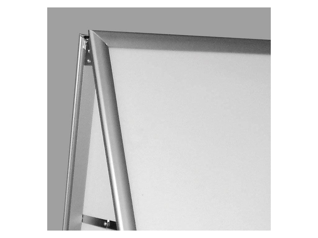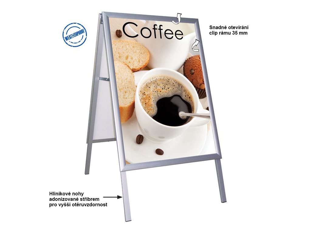 - Oboustranný reklamní stojan A vhodný pro venkovní použití s matnou ABS fólií pro překrytí plakátu, UV fitrem a hrubou úpravou pro lepší čitelnost.