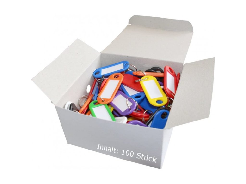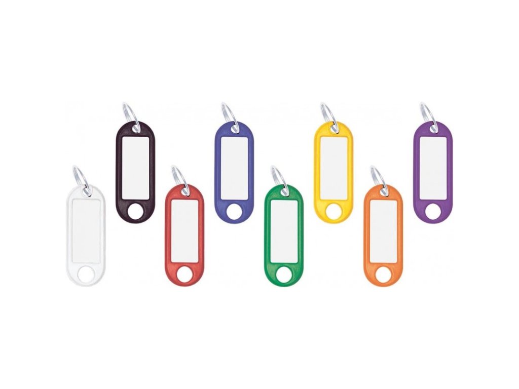 - plastové jmenovky na klíče s popisným štítkem s kovovým kroužkem pro uchycení klíčů.