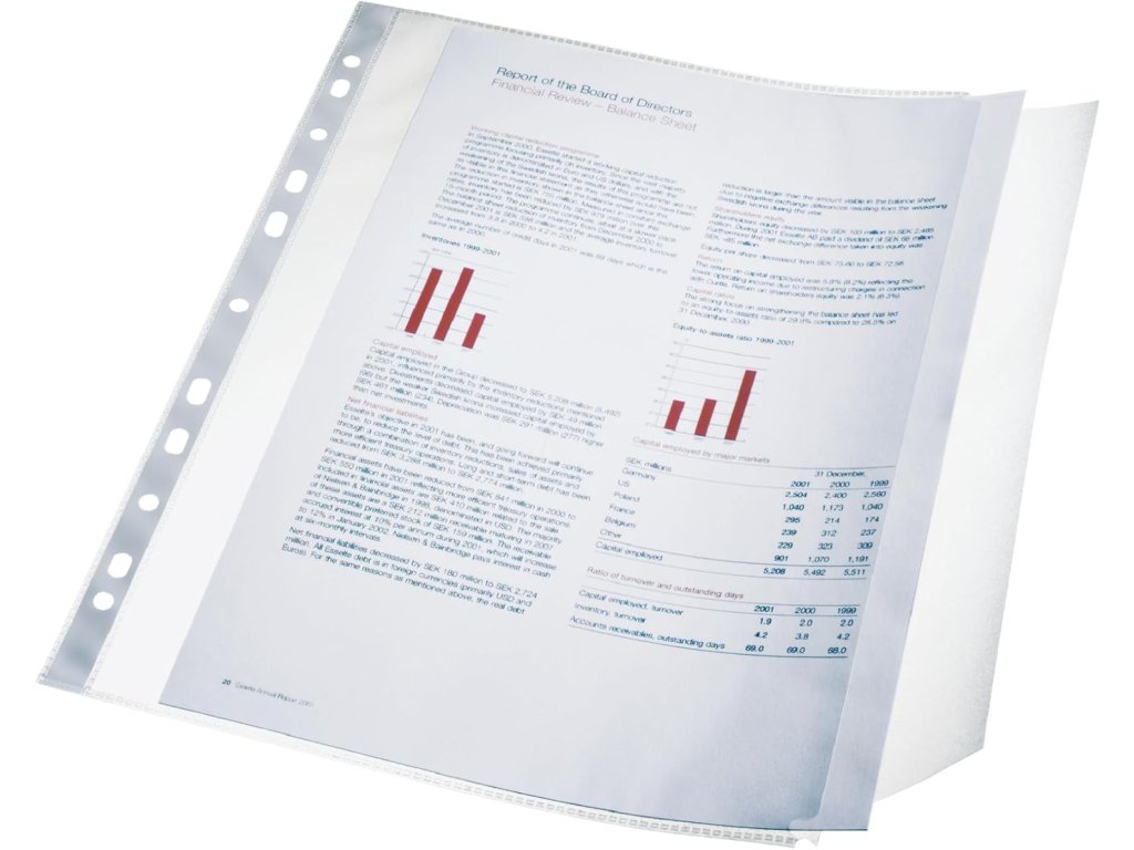 Závěsný euroobal Esselte s boční chlopní je určen pro bezpečné uložení dokumentů formátu A4 do pořadačů. Boční otevření umožňuje snadný přístup bez nutnosti vyjmutí kapsy z mechaniky.